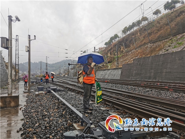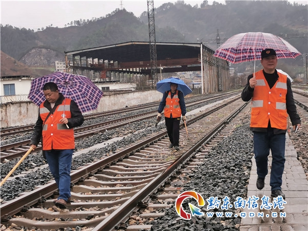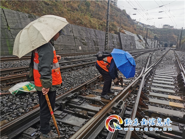 圖為2月9日,凱里工務(wù)段包保、對(duì)點(diǎn)服務(wù)干部冒雨積極開展“保春運(yùn)”鐵路設(shè)備專項(xiàng)檢查,確保山區(qū)鐵路安全暢通。(葉志權(quán))