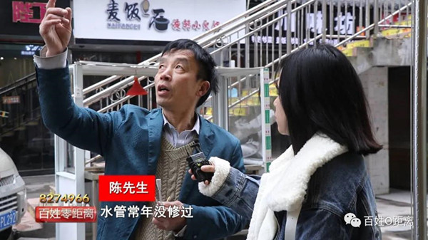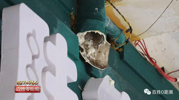 陳先生:原因是因?yàn)橹胁〦棟的住戶水管常年沒(méi)有維修,堵了之后水不知道往哪里走,之后就不知道是誰(shuí)家來(lái)把水管敲了,那天來(lái)敲的時(shí)候是星期六的晚上,但是這監(jiān)控是壞的,找不到人,之后水就一直往下滴,一直滴了兩個(gè)月。