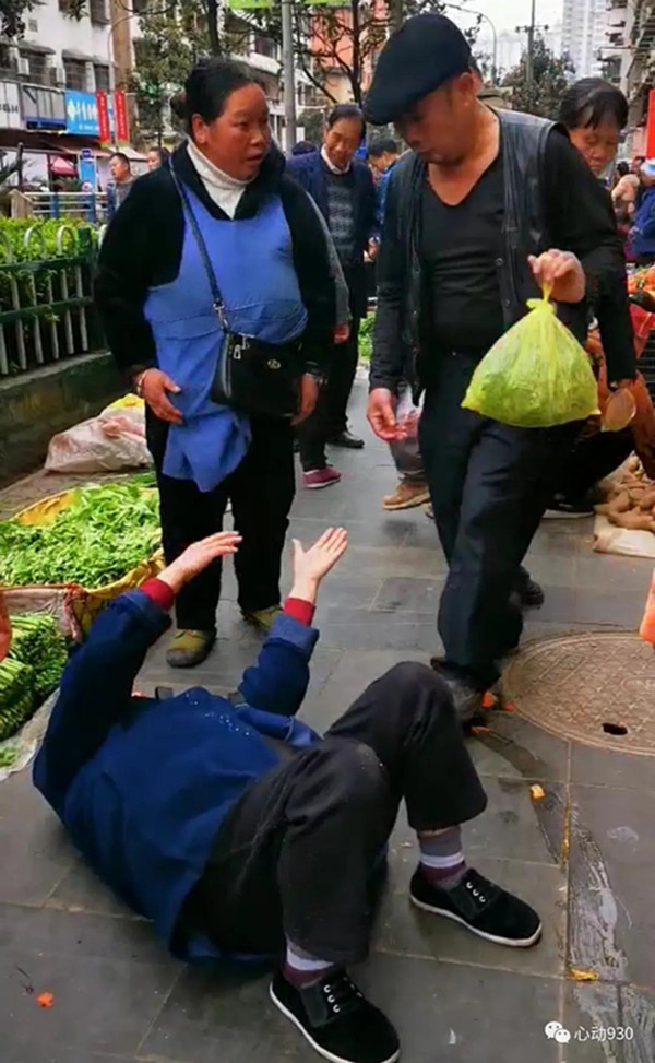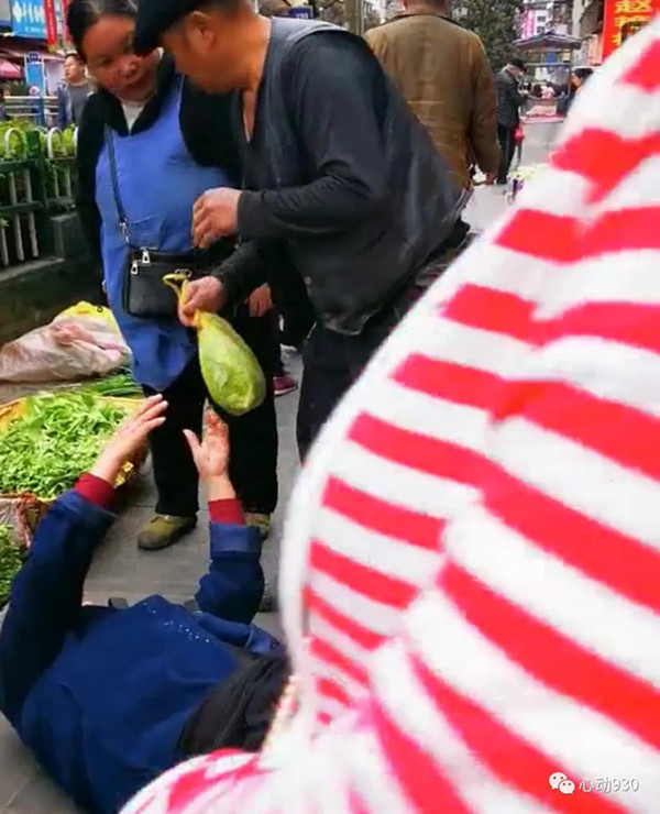 據周女士介紹,摔倒的老人應是獨自一人出門,路過二商場的一個菜攤時,不知踩到了什么,腳下一滑仰面重重摔倒,躺在了地上,這突發的一幕讓周邊攤販和路人都嚇了一跳。