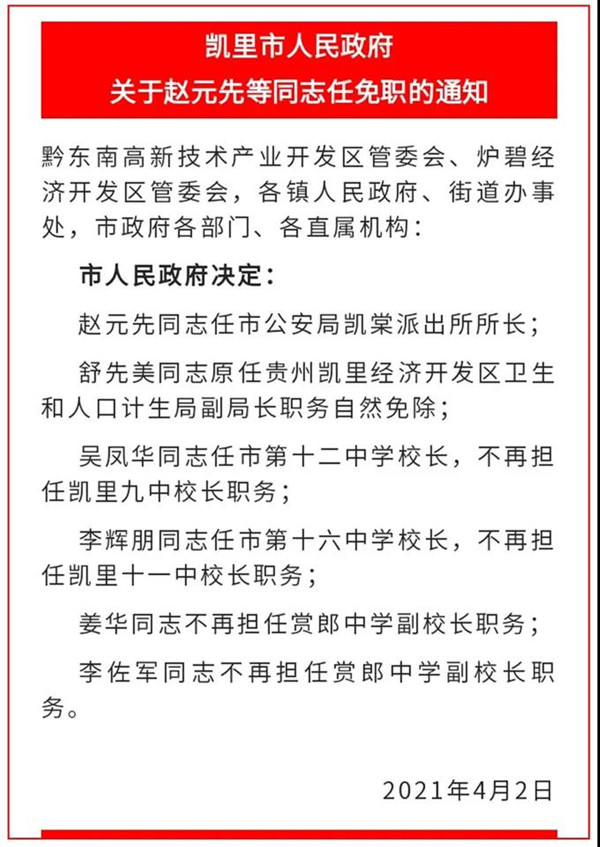時間:2021-04-09 13:13:25  來源:凱里市人民政府發布最新人事任免通知