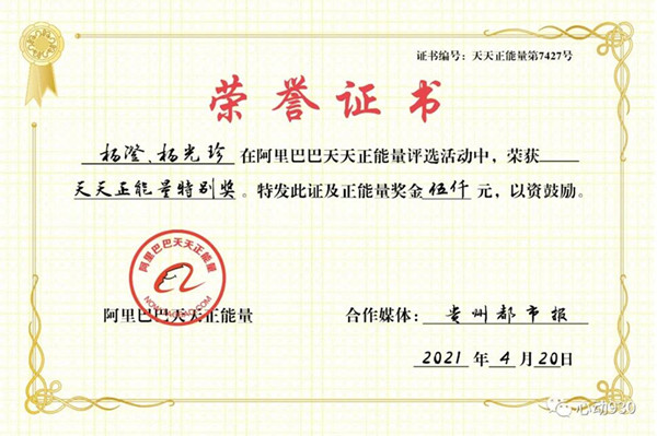 不僅如此,貴州都市報聯合阿里巴巴天天正能量授予超市員工楊澄、楊光珍天天正能量特別獎,及5000元正能量獎金,將人心的暖、陌生人的善默默傳遞。