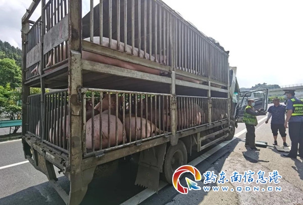 5月3日下午15時,凱里高速公路管理處凱里路政執法大隊路政員巡查至G60滬昆高速(凱麻段)K1709+400上行(凱里往貴陽方向)時,發現一輛貨車載著一車生豬,停在行車道上,一名男子正在檢查車況。現正值“五一”期間,車流量較大,不時有車輛從旁邊呼嘯而過。路政員立即靠邊停車,拉響警笛,在車輛后方擺放安全警示標志。路政員經詢問駕駛員了解到,該男子從凱里運輸整車生豬前往貴陽,一共36頭,因剎車故障,無法繼續前行。當時氣溫31攝氏度,車內的“二師兄”被熱得嚎嚎大叫。駕駛員焦急的告訴路政員,如果這些豬熱死了,自己的損失就大了。路政員考慮到駕駛員的難處,立即聯系最近服務區的維修人員前來維修車輛,15時33分,車輛維修完畢。