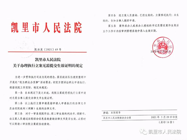 為進一步貫徹執行司法為民的理念,扎實開展“我為群眾辦實事”活動, 方便當事人申請執行,5月20日,凱里市法院出臺《關于辦理執行立案無需提交生效證明的規定》。即日起,當事人申請強制執行無需提交法律文書生效證明。