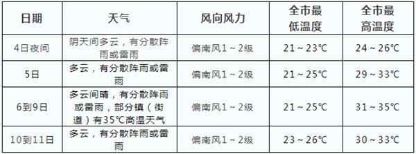 7月5日到11日我市以晴熱少雨天氣為主,午后到傍晚有分散熱雷雨,部分鎮(街道)有35℃的高溫天氣,需注意防雷安全;同時氣溫高,長時間戶外活動注意防暑防曬。