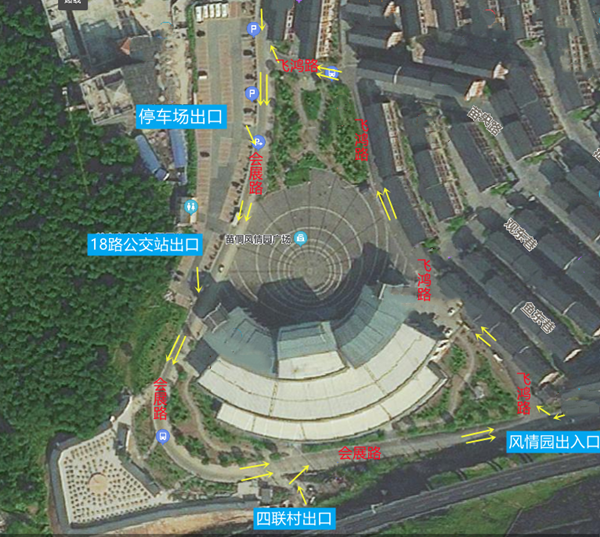 會展中心周邊的會展路駛入、飛鴻路路口駛出。