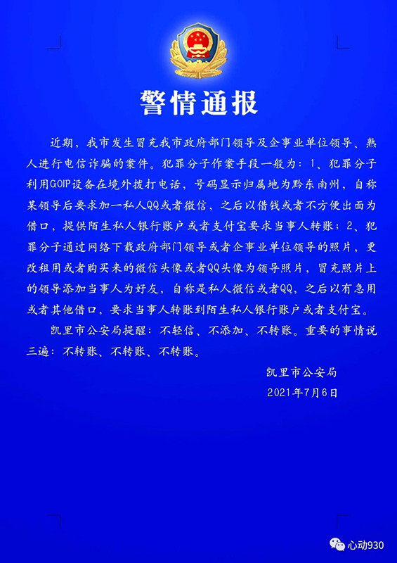 警惕!凱里市公安局發布警情通報,近期有人冒充政府領導實施詐騙