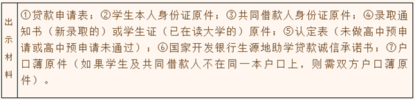 (一)首次貸款:①貸款申請表;②學生本人身份證原件;③共同借款人身份證原件;④錄取通知書(新錄取的)或學生證(已在讀大學的)原件;⑤家庭經濟困難學生認定申請表(未做高中預申請或高中預申請未通過學生需提供);⑥國家開發銀行生源地助學貸款誠信承諾書;⑦戶口薄原件(如果學生及共同借款人不在同一本戶口上,則需雙方戶口薄原件)。