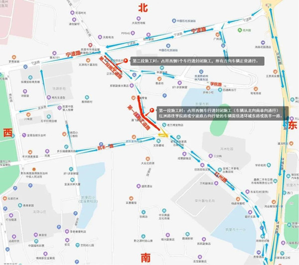 第一段占道施工時:車輛需由北向南單向行駛(金井路環形交叉口段往金井路公廁方向),紅洲路往學院路或寧波路方向行駛的車輛需繞道環城東路或凱豐一路。