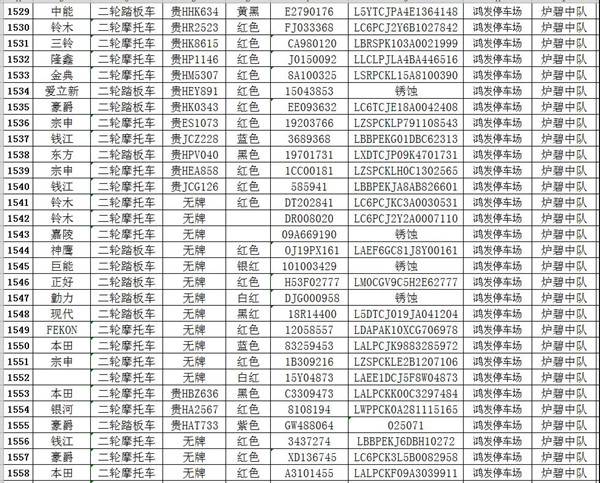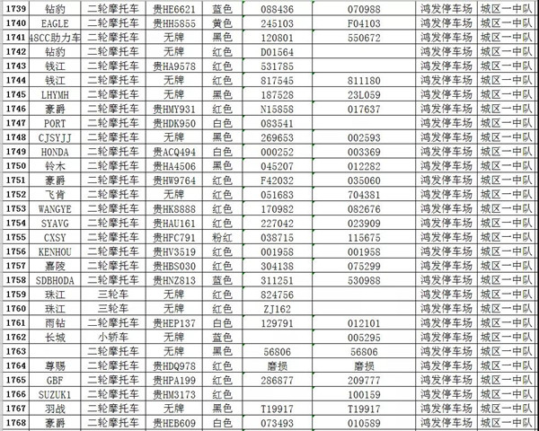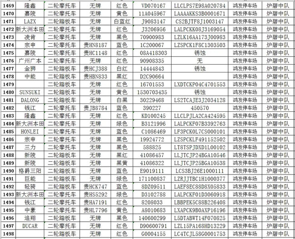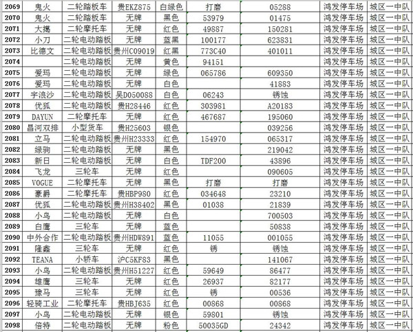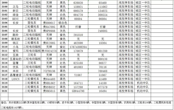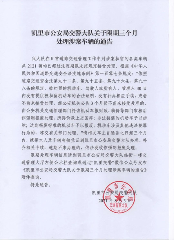 我大隊在日常道路交通管理工作中對涉案扣留的各類車輛共2121輛均已超過法定期限未按規定接受處理。根據《中華人民共和國道路交通安全法實施條例》第一百零七條規定:“依照道路交通安全法第九十二條、第九十五條、第九十六條、第九十八條的規定,被扣留的機動車,駕駛人或所有人、管理人30日內沒有提供被扣留機動車的合法證明,沒有補辦相應手續,或者不前來接受處理,經公安機關公告3個月仍不前來接受處理的,由公安機關交通管理部門將該機動車報財政、物價等部門審核后作強制報廢處理,所得價款上交國庫;非法拼裝的機動車予以拆除;達到報廢標準的機動車予以報廢;機動車涉及其他違法犯罪行為的,移交有關部門處理。”請相關車主自通告之日起三個月內,攜帶本人及車輛有效憑證到凱里市公安局交警大隊辦理、補齊相關手續,逾期不來辦理的,依法沒收作強制報廢處理。