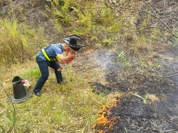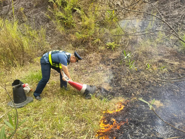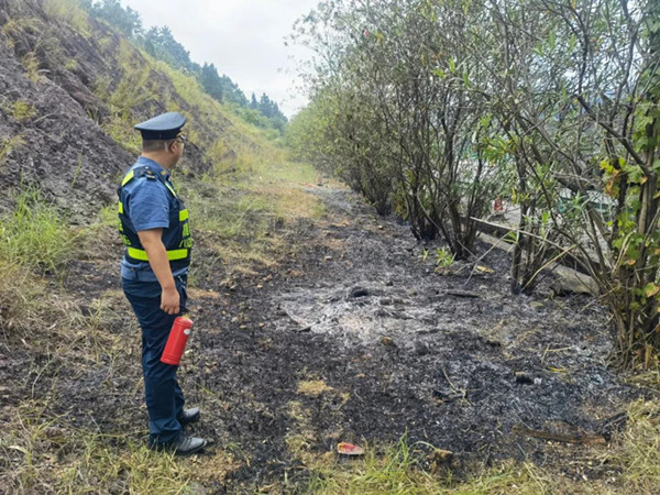 路政員立即將車輛停靠在安全地帶,設(shè)置相應(yīng)的安全警示標(biāo)志,同時(shí)拉響車載警報(bào)器,提示過往車輛減速慢行;另一方面立即取出隨車攜帶的滅火器化身“消防員”,迅速開展滅火行動(dòng),努力控制火勢(shì)的進(jìn)一步蔓延。經(jīng)過20分鐘的奮力撲救,山火被路政員成功撲滅。為避免火情出現(xiàn)復(fù)燃隱患,路政員再次仔細(xì)勘察了現(xiàn)場(chǎng),直到確認(rèn)無復(fù)燃情況,高速通行安全暢通后方才撤離現(xiàn)場(chǎng)。