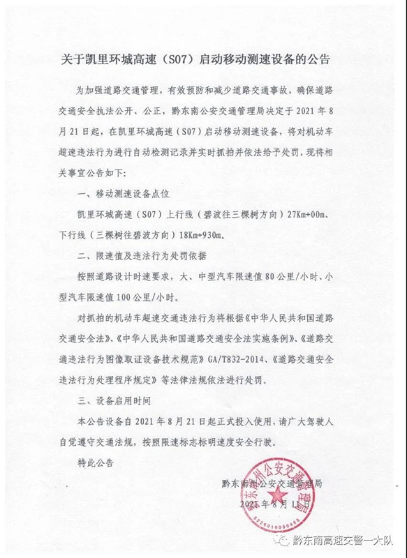 為加強道路交通管理,有效預防和減少道路交通事故,確保道路交通安全執法公開、公正,黔東南公安交通管理局決定于2021年8月21日起,在凱里環城高速(S07)啟動移動測速設備,將對機動車超速違法行為進行自動檢測記錄并實時抓拍并依法給予處罰,現將相關事宜公告如下: