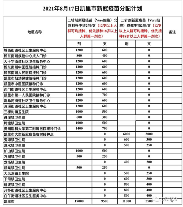 需要提醒的是,8月17日-8月23日期間,凱里市重點對18歲以上的人群進行新冠疫苗第一劑接種,24日后將接種重心轉移到12-17歲兒童及第二劑、第三劑未接種的市民,請廣大市民合理安排好時間。