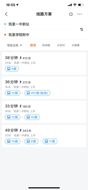 當然,如果你對線路不熟悉,掌上公交會為你提供 " 線路方案 ",推薦最優出行方案。首頁→ " 去哪 " →輸入起點和終點站,智能規劃距離短、少步行、少換乘等多種乘車方案供選擇。