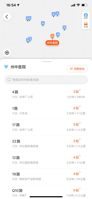 進入 " 一鍵查車 " 頁面,地圖顯示附近所有公交站點,點擊任意公交車圖標可切換站點。