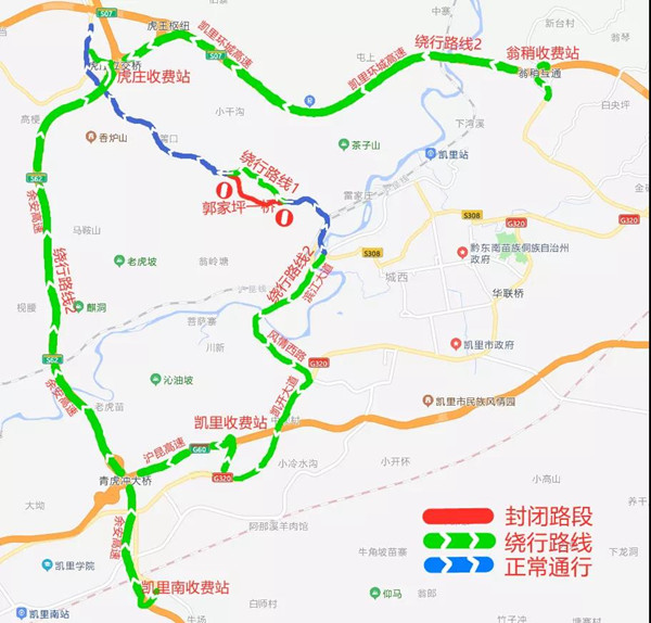 2、行經(jīng)凱里至虎莊往返的其它社會車輛及大型車輛,建議經(jīng)高速凱里站或環(huán)高翁稍站-高速凱里北站繞行。