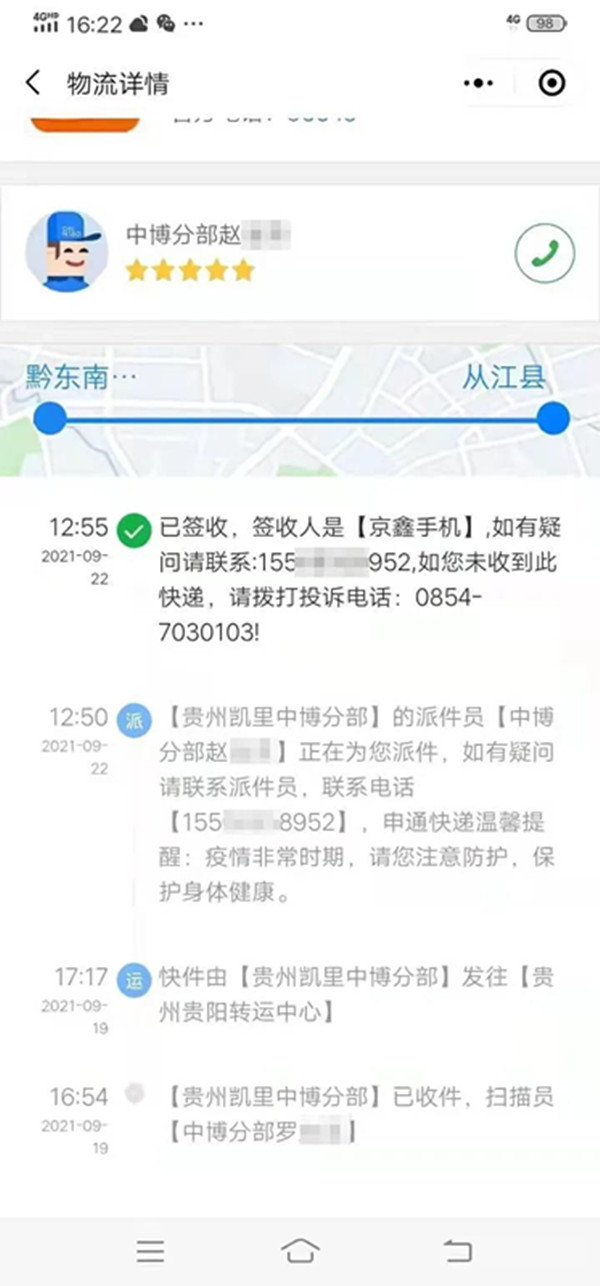 (根據(jù)物流顯示,包裹從凱里發(fā)往貴陽(中轉(zhuǎn)),但卻沒有抵達(dá)中轉(zhuǎn)的相關(guān)信息,之后又在凱里被申通快遞簽收。)