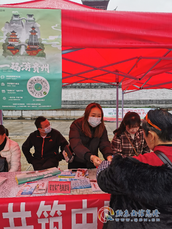 活動現場,市文旅局工作人員熱情地為前來咨詢的市民群眾提供旅游信息咨詢服務,并引導群眾通過手機下載小程序“一碼游貴州”,關注公眾號“暢游凱里”、“凱里市文化館”等,讓群眾更加了解我市各景區景點、公共文化服務場、文物保護單位提供的便捷服務。