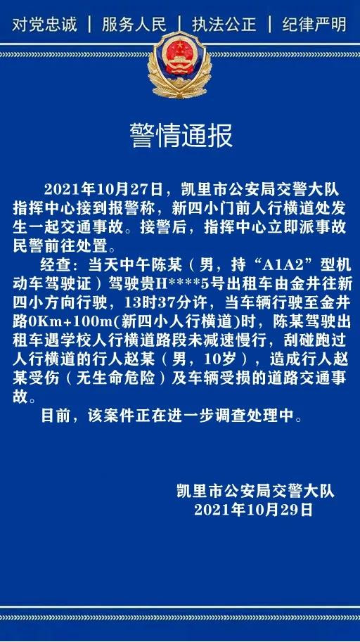 經(jīng)查:當天中午陳某(男,持“A1A2”型機動車駕駛證)駕駛貴H****5號出租車由金井往新四小方向行駛,13時37分許,當車輛行駛至金井路0Km+100m(新四小人行橫道)時,陳某駕駛出租車遇學校人行橫道路段未減速慢行,刮碰跑過人行橫道的行人趙某(男,10歲),造成行人趙某受傷(無生命危險)及車輛受損的道路交通事故。