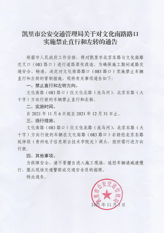根據市人民政府工作安排,將對凱里市北京東路與文化南路交叉口(083路口)進行道路渠化改造,為確保施工期間道路交通安全、暢通,決定對文化南路路口(083路口)實施禁止車輛直行和左轉的管制措施,現將有關事項通告如下: