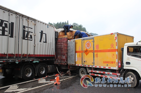 7時55分,麻江縣消防大隊3輛消防救援車趕赴事故現場,首先對兩車貼合處進行了全方位的噴淋,然后鋪設好多根管帶,隨時應對突發狀況。隨后,黔東南州應急局、麻江縣人民政府、縣應急局、縣公安局、縣交通綜合行政執法大隊和黔東南州交警支隊高速一大隊、省交通運輸綜合行政執法七支隊一大隊有關領導和技術人員陸續到達事故現場,在對現場安全情況進行全面分析并征得駕駛員同意后,決定先轉運30噸煙花爆竹,再對事故車輛進行拖離。