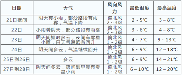 【摘要】預計本周一我市受強冷空氣影響,將出現明顯降溫天氣,城區最高氣溫6℃左右;周二以后氣溫逐漸回升。日最高氣溫14~21℃,將出現在25日;日最低氣溫3~6℃,將出現在22日。