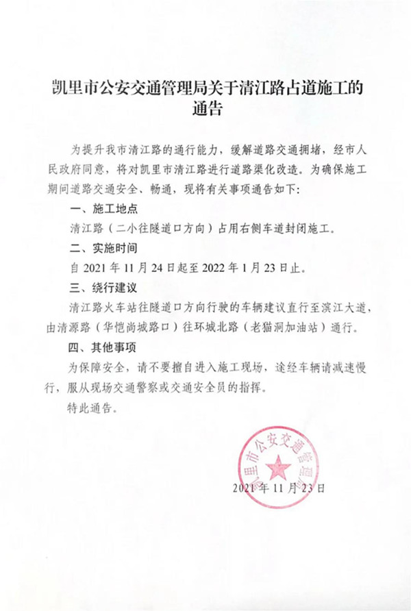為提升我市清江路的通行能力,緩解道路交通擁堵,經(jīng)市人民政府同意,將對凱里市清江路進行道路渠化改造。為確保施工期間道路交通安全、暢通,現(xiàn)將有關(guān)事項通告如下: