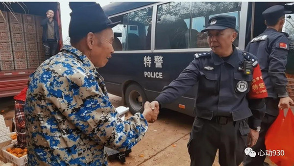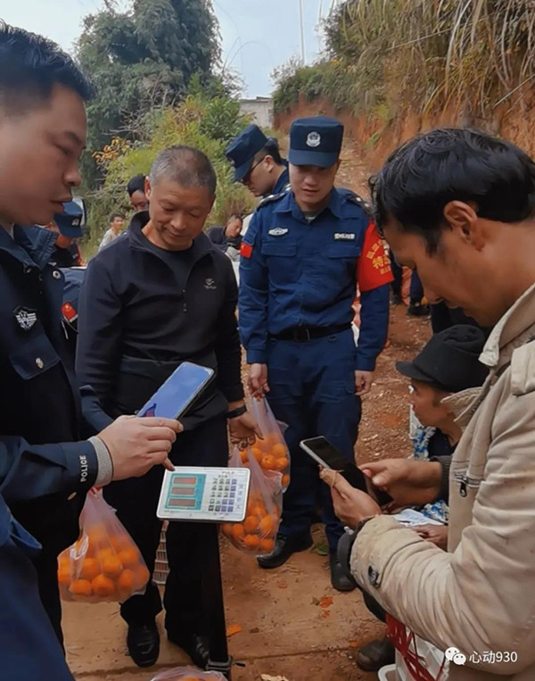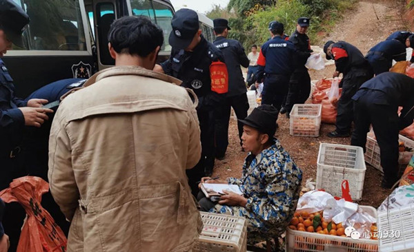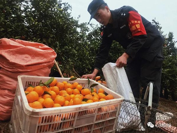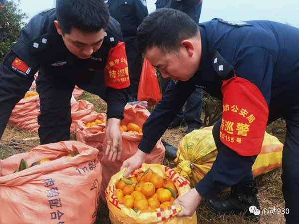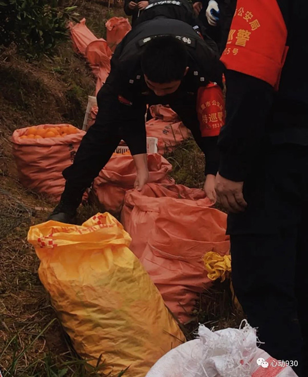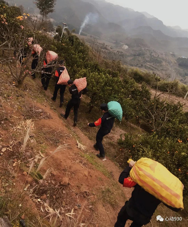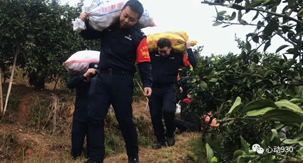 抬著水果下山時,特巡警們成了山里一條靚麗的風景線,在完成裝車后,特警們還自掏腰包,買下200多斤橘子。