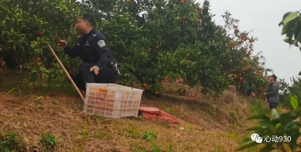 就這樣,特警們有的爬到樹上,有的在樹下,有的忙著裝箱,有的抬到山下,個個忙得滿頭大汗,近三個小時的時間,采摘的橘子就堆積如山了。