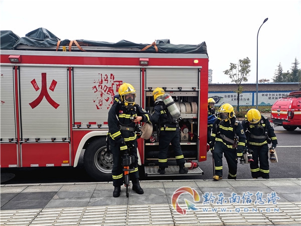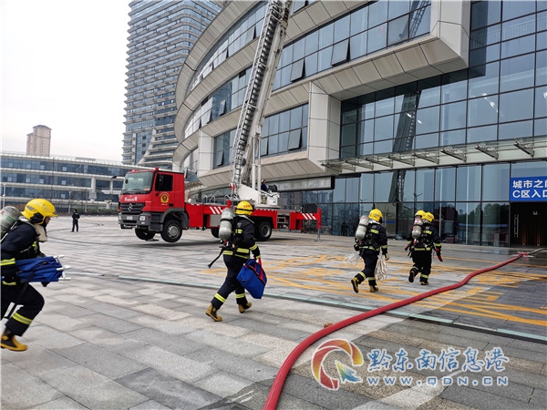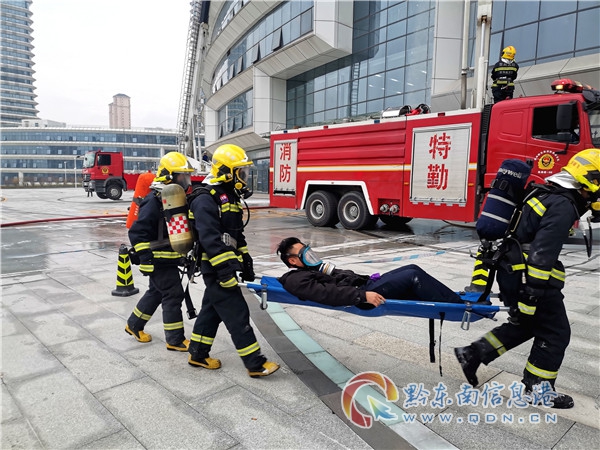 演練模擬“未來城城市之門C座9層發(fā)生火災(zāi),多名人員被困”場(chǎng)景,從“發(fā)現(xiàn)起火社區(qū)及物業(yè)公司立即組織進(jìn)行被困疏散、救助以及前期的火災(zāi)控制——撥打消防報(bào)警電話和衛(wèi)生救護(hù)電話——黔東南消防支隊(duì)和城西衛(wèi)生中心接到電話后緊急到達(dá)現(xiàn)場(chǎng)——集體協(xié)作救援處置”全過程。