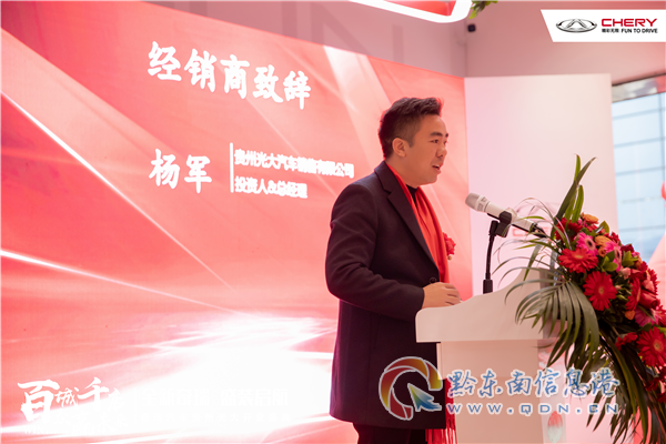 奇瑞汽車貴州光大4S店投資人楊軍在致辭中表示,今天是值得紀念的一天,在奇瑞汽車的引領下,奇瑞汽車貴州光大4S店經過積極籌備,終于迎來了正式開業這一刻。并代表奇瑞汽車貴州光大4S店對各位領導、各位來賓的關心、幫助,以及各位員工的努力工作,表示衷心的感謝。