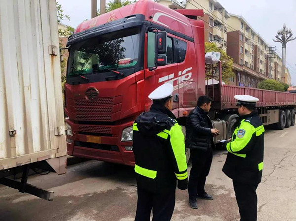 12月14日下午,凱里市公安局交警大隊爐山中隊在爐山鎮騰飛路巡邏時,發現一輛貨車正在給一重型半掛牽引車進行加油。
