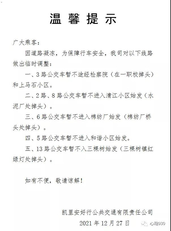 截止2021年12月27日10時公交運營情況:線路30條,車輛303輛;暫時恢復(1、2、3、4、5、6、7、8、9、10、11、12、13、15、16、17、18、19、20、21、22、28路)22條線路;其余(301、302、305、306、201、202、25、29)路8條線路暫時停運,預計恢復時間待通知。