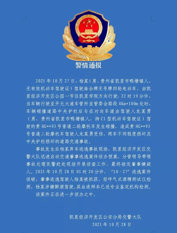 事故發(fā)生后,楊某棄車逃逸事故現(xiàn)場,凱里經(jīng)濟開發(fā)區(qū)交警大隊迅速啟動交通肇事逃逸案件偵辦預(yù)案,分管領(lǐng)導(dǎo)帶領(lǐng)事故處理民警趕赴現(xiàn)場開展偵查工作,最終鎖定肇事嫌疑人。2021年10月28日 01時20分許,“10·27”逃逸案件偵破,肇事逃逸駕駛?cè)藯钅潮蛔カ@,經(jīng)呼氣式酒精測試儀檢測,楊某涉嫌醉酒駕駛,其血液樣本已送專業(yè)鑒定機構(gòu)檢測。