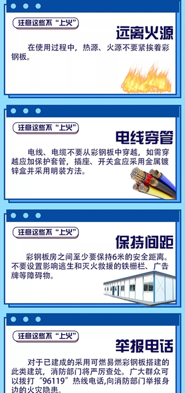 阿消提醒:泡沫夾芯板內部裹著的是易燃的聚苯乙烯、聚氨酯泡沫,一經點燃立即熔化燃燒,不僅燃燒速度快,還會產生大量的有毒有害氣體,從而危害到周邊人群的生命安全,火災隱患極大!