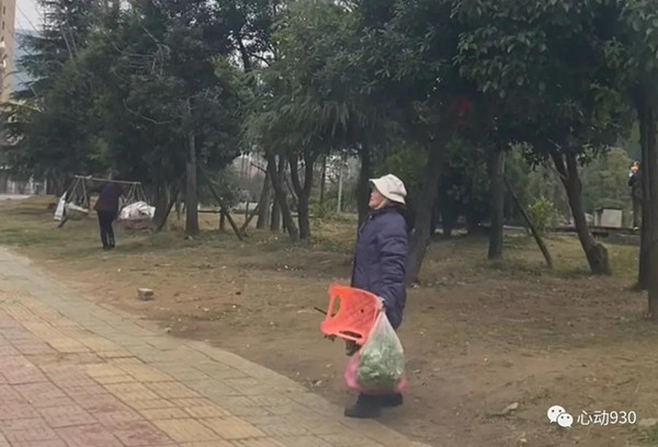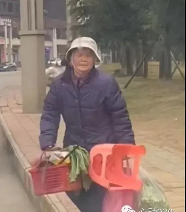 “當時老人手提著一筐菜,一看就是自己家種的,但是估計她眼睛不好,半閉著,靠腳摸索不斷向前進,看著挺心酸的”。
