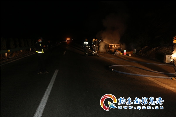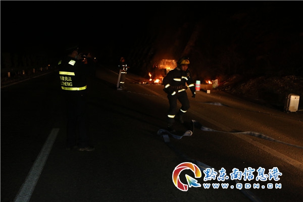 熟悉,10﹕10分高速路政、消防隊、高速交警同時抵達現場各司其職開展救援,只見現場濃煙滾滾,小型貨車已被大火吞沒,所幸車內無人員被困,路政員在做好現場警戒,同時消防隊迅速設立水槍陣地開始滅火。10﹕18分大火被黎平縣消防救援大隊迅速將火撲滅,所幸未造成人員傷亡撲滅,約二十分鐘后,火災被成功撲滅,消防員在確認車輛無復燃的可能性后撤離現場。10﹕20分在“一路多方”積極配合,本著快速出動、快速撤離、快速施救、快速清障、快速恢復交通,嚴防發生二次事故,保障司乘人員安全,最終在多部門的協作下,交通恢復正常通行。