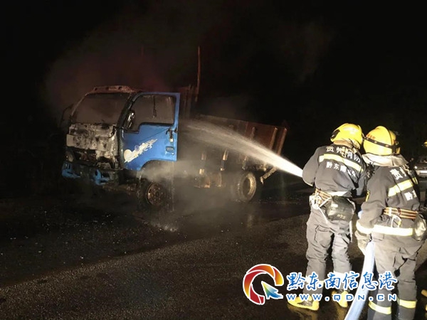 05時43分,黎平縣消防救援大隊到達現(xiàn)場,經(jīng)偵察,現(xiàn)場事故車輛車頭已被大火吞噬,冒著滾滾濃煙。