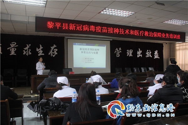 本網訊 3月26日,黎平縣衛健局在黎平縣人民醫院六樓會議室組織舉辦新冠病毒疫苗接種技術和醫療救治保障業務培訓班開班授課。全縣各醫療機構負責急診急救工作的 284名醫務人員參加了培訓。