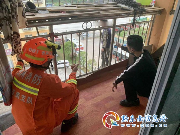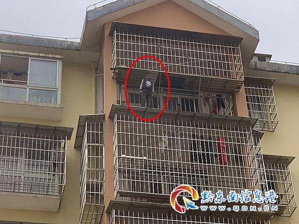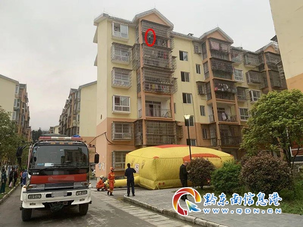 18時24分消防救援人員到達后發現,一小男孩站在樓層5樓防盜窗架外的頂棚上,神情憂郁,時不時向下張望,民警正在防盜窗內對其進行勸說,了解情況后,其中一組消防人員迅速在地面鋪設救生氣墊進行保障,防止小男孩墜樓受傷;另一組作戰人員穿安全吊帶做好小男孩隨時跳樓營救準備,同時指揮員與民警在防盜窗內積極勸導,試圖穩住小孩子情緒,但小孩說什么都不聽,小孩腿腳已出現麻木現象,并由站立的姿勢變成蹲下去的姿勢,隨時有墜下去的可能,情況十分危險。