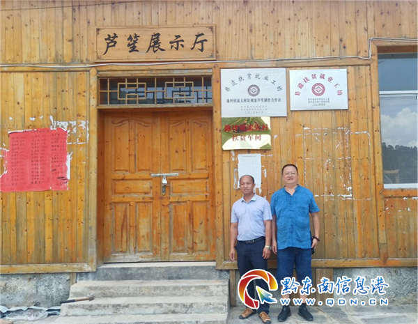 (圖為縣非遺中心主任徐業(yè)禮和滾大村民委主任滾書財(cái)在滾大村培利寨蘆笙制作合作社門前共同掛牌后合影)