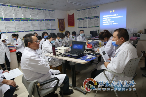 (李健民教授(左一)通過指導搶救心肌梗死患者手術成功后,又組織對手術作理論分析,毫不保留地把技術和經驗傳授給黎平縣人民醫院的有關醫生。)