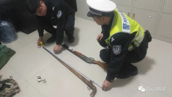 民警魏小波、楊正寅發現兩人隨身背著的編織袋疑似槍管,出于職業敏感,民警立即對兩人進行盤查,發現編織袋內裝著一把老式火藥槍和一把氣槍,同時還有火藥、鋼珠等違禁品。民警立即呼叫中隊派警支援,并在現場進行人槍分離。