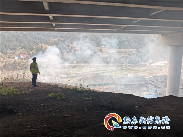 本網訊 1月11日上午,雷山路政執法大隊路政員在開展日常巡查至G60滬昆高速K1663+200上行快接近蒿芝寨大橋時,發現橋上煙霧彌漫,一陣陣濃煙不斷從橋下竄上來,遮擋過往駕駛員視線,嚴重影響高速公路行車環境。見狀,路政員立即將車輛停靠在安全地帶,前往橋下查看情況。