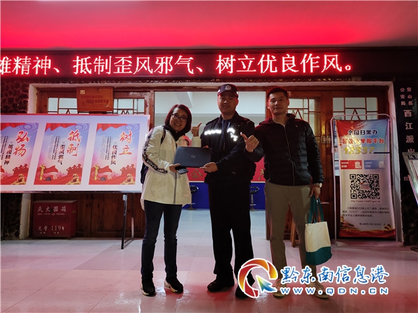 原來,4月17日19時許,北京市游客李娜向雷山縣公安局西江派出所報警稱,其及同伴一行從景區西門乘坐觀光車至長肖下車時將放在座位旁的手提包忘記,被人撿走,包內有價值10000余元的筆記本電腦。接警后,民警文鎮東、輔警宋世華立即調取觀光車和長肖路段的監控視頻,經過兩小時的視頻查看,鎖定系一男子將手提包撿走,民警根據視頻監控又調取了景區實名制購票系統獲知撿包人系廣東游客王某,民警經過聯系王某后,王某承認撿得手提包。