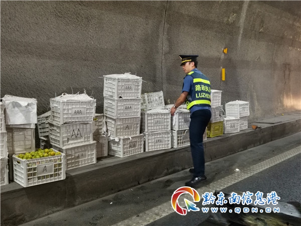 接警后,路政員立即驅車前往,抵達現場后,車輛已經造成了一公里以上的擁堵。事故車輛側翻在南市隧道內,所運貨物李子灑落一地,占用了隧道內的所有車道。因隧道空間有限,救援難度大,于是路政員立即啟動聯勤聯動機制。一是根據交通中斷的情況,救援車從臺江上站逆行至事故點開展救援。二是通知養護部分立即趕赴現場開展清掃工作。三是高速路政聯合高速交警、高速應急協助駕駛員轉移貨物。四是立即上報事故信息,提示過往車輛注意路況,避免二次事故的發生。