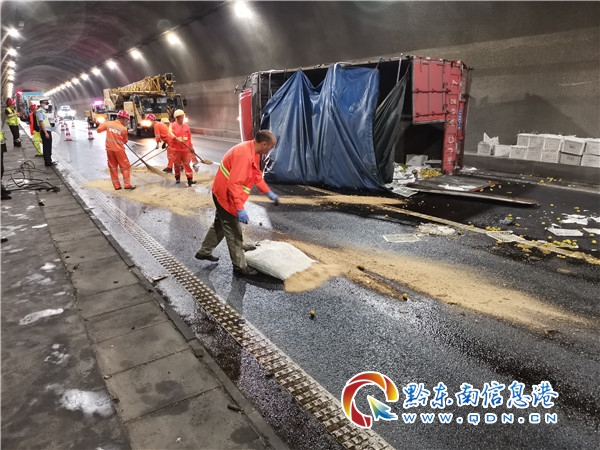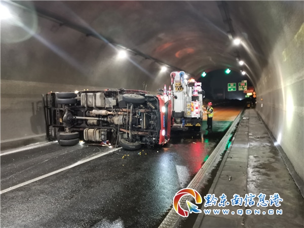 本網訊 6月26日凌晨2:30分許,雷山路政執法大隊路政員接轄區高速交警來電稱:“G60滬昆高速K1640+000下行臺江縣城附近有一輛貨車發生事故,無人員傷亡,交通中斷,請立即趕赴現場。”