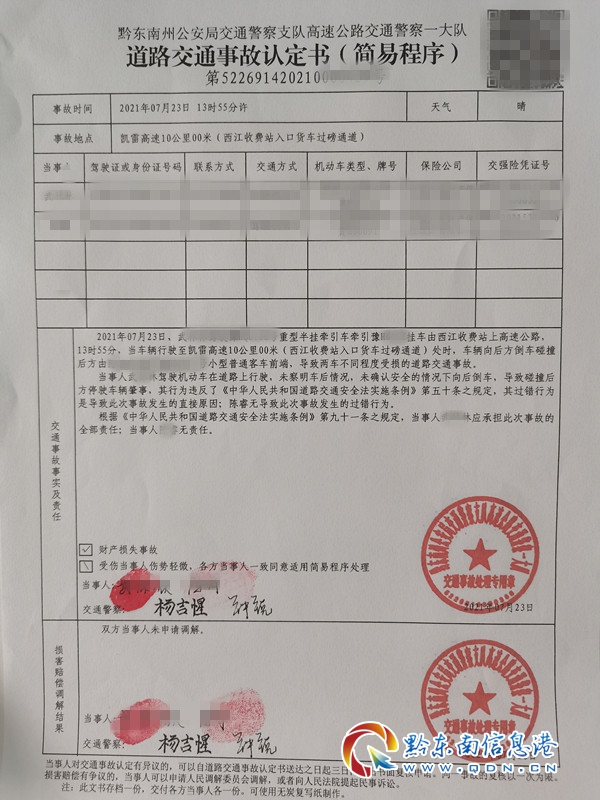 本網訊 2021年7月23日13時50分左右,貴州省黔東南州交警支隊高速一大隊值班室接到報警電話稱:在凱雷高速西江收費站入口處,兩車發生追尾,無人員受傷,請求出警處理。
