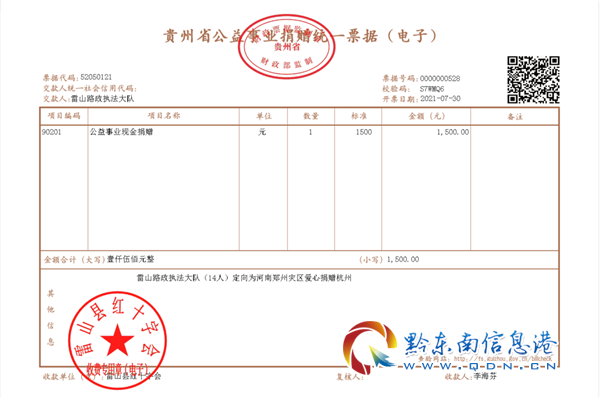 活動中,大隊負責人趙劍鋒主動帶頭捐款,大家積極響應,主動捐款。休班在家的干部職工也紛紛通過微信轉賬主動參與捐款活動。隨后,雷山路政執法大隊來到雷山縣紅十字會,親手送上向河南災區捐贈的1500元人民幣。雷山縣紅十字會會長關雪代表紅十字會收下了捐款,并將捐款發票交到大隊負責人趙劍鋒手上,她表示,雷山縣紅十字會將第一時間把捐款電匯到河南省紅十字會,用于采購救災物資,支援災區搶險救災工作。同時非常感謝雷山路政執法大隊的愛心義舉。