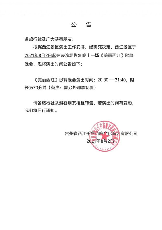 西江景區(qū)于2021年8月2日起調(diào)整《美麗西江》歌舞晚會演出時間,現(xiàn)將調(diào)整后的演出時間公告如下: