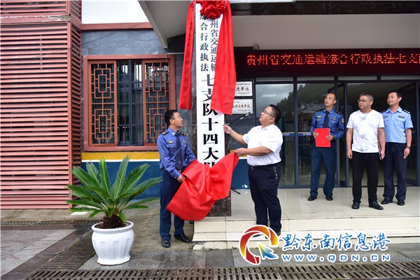揭牌儀式由貴州省交通運輸綜合行政執法七支隊十四大隊負責人趙劍鋒主持。雷山縣交警大隊、雷山縣交通局、雷山縣公路管理段、雷山縣應急局等單位有關領導出席儀式。雷山縣人民政府副縣長許亮在致辭中向貴州省交通運輸綜合行政執法七支隊十四大隊表達熱烈祝賀,希望大家再接再厲,進一步履行交通工作職責。